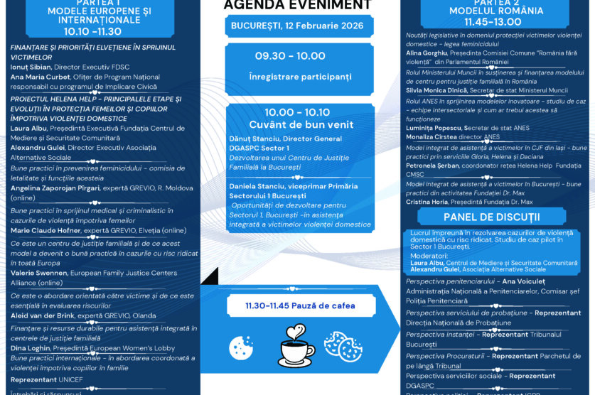 Direcția Generală de Asistență Socială și Protecția Copilului Sector 1 are onoarea de a găzdui conferința de lansare a proiectului pilot HELENA HELP – Rețeaua Centrelor de Justiție Familială din România, un demers național care își propune să îmbunătățească răspunsul instituțional în cazurile de violență domestică și să asigure servicii integrate, accesibile și centrate pe nevoile victimelor.