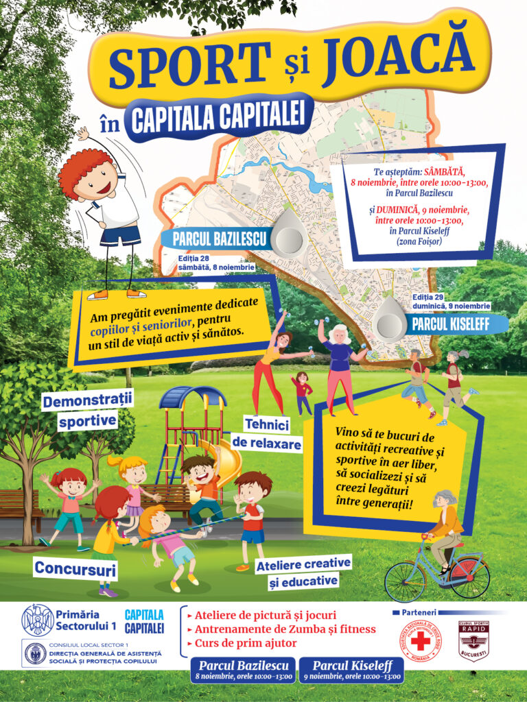 Din cauza condițiilor meteo nefavorabile, vă informăm că evenimentul de mâine, 4 octombrie, programat în Parcul Kiseleff, va avea loc duminică, 5 octombrie, unde vă așteptăm să ne bucurăm împreună cu jocuri și voie bună.